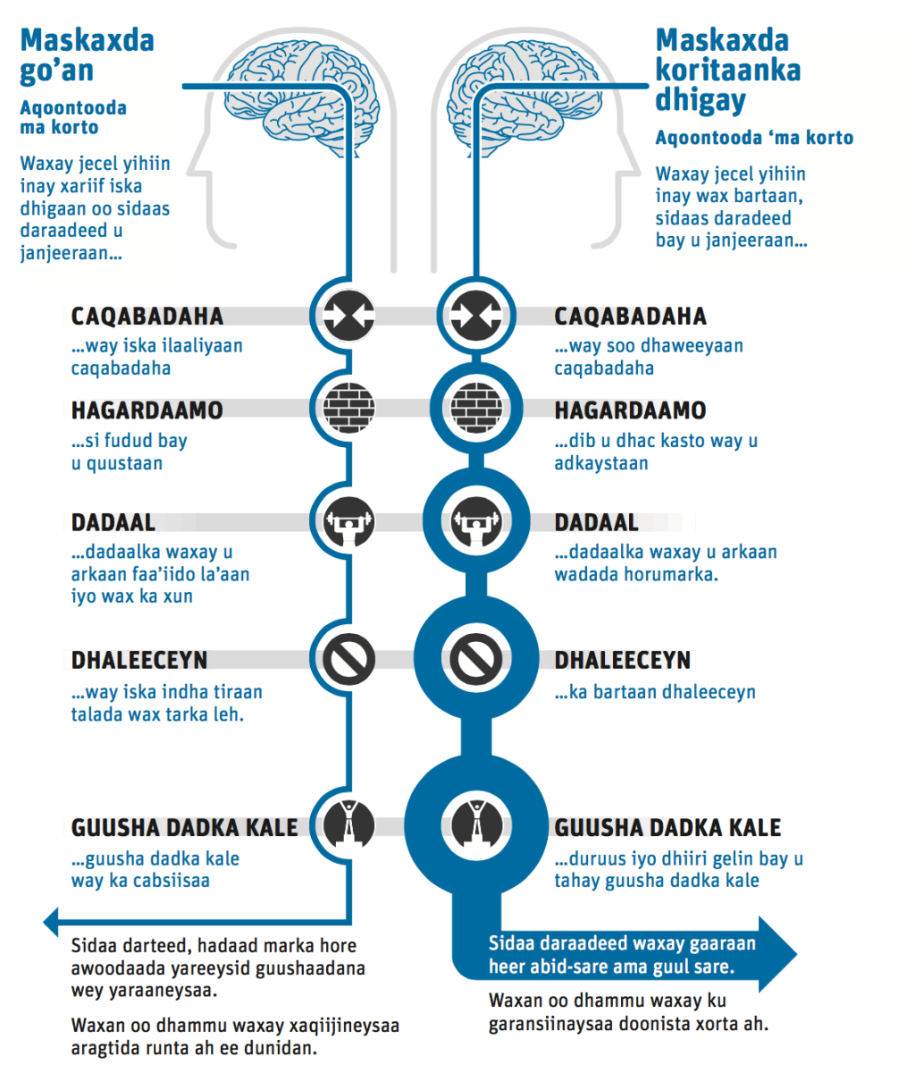 Marka lala kulmo caqabadooyin kuwa barbarta maskaxda koritaanka ayaa u kaco ka hortaga caqa- badooyinkaas. inta badan, dadka leh maskaxda koritaanka kama cabsadaan fashilka laakiin waxay u arkaan inay fursad u heleen inay is wanaajiyaan oo ay aqoontooda saro u qaadaan.